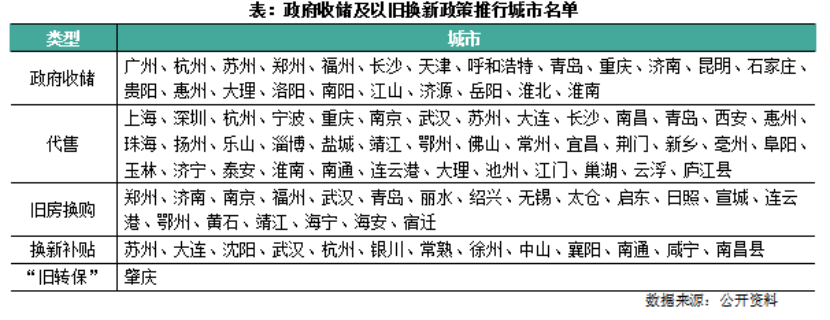(圖源:克而瑞研究中心,統(tǒng)計(jì)截止時(shí)間:2024年6月24日) 值得一提的是,隨著居民住房信貸政策的全方位松綁,一些地方出現(xiàn)了首付折上折、5年零月供、先息后本、高評(píng)高貸等非常規(guī)操作。例如,山東膠州家庭首套房首付可以先交50%,剩下的50%緩交1—2年,首付比例低至7.5%,而成都和昆明部分項(xiàng)目和商業(yè)銀行則推出了“先息后本”政策,前期僅需償還當(dāng)月利息,后期剩余本金按常規(guī)等額本金或等額本息方式還款。 超過80個(gè)城市及區(qū)縣推出“以舊換新” 住房限貸政策的調(diào)整,降低了置業(yè)的門檻及月供負(fù)擔(dān),而另一政策“以舊換新”,成為今年以來(lái)各地打通一二手房交易的障礙,促進(jìn)改善型購(gòu)房加速入市的主流政策工具。 58安居客研究院統(tǒng)計(jì)數(shù)據(jù)顯示,截至目前,已有河北、江蘇、山東、浙江、河南、四川、遼寧、安徽、湖北、福建、湖南、江西、廣東、陜西、廣西、甘肅、貴州、云南省內(nèi)的80多個(gè)城市或者區(qū)域提出以舊換新政策,并且具體模式已經(jīng)過至少三個(gè)版本的迭代。 除了在銷售端推動(dòng)“以舊換新”外,“以舊換新”也成為樓市“去庫(kù)存”工具箱中的一部分。 5月17日,央行宣布將設(shè)立3000億元保障性住房再貸款,支持地方國(guó)企收儲(chǔ)存量房。6月12日,央行召開保障性住房再貸款工作推進(jìn)會(huì),提出要加強(qiáng)統(tǒng)籌協(xié)調(diào),建立工作專班,地方政府在權(quán)限內(nèi)給予適當(dāng)?shù)恼咧С?,降低?shí)施主體經(jīng)營(yíng)成本。6月20日,住建部會(huì)議明確存量房收儲(chǔ)支持范圍擴(kuò)大至縣級(jí)市。