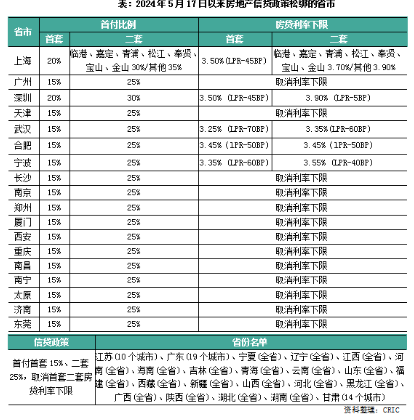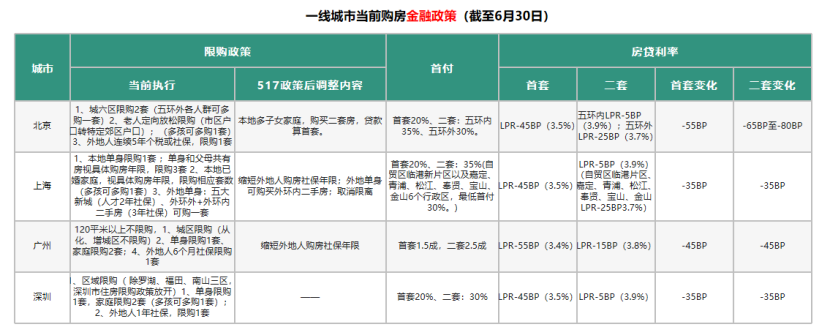 (圖源:58安居客研究院) 首付比例低至15%、取消全國(guó)層面房貸利率下限 今年上半年,央行、金融監(jiān)管總局等部門持續(xù)推出多項(xiàng)金融舉措,涉及下調(diào)最低首付比、取消房貸利率下限、下調(diào)公積金貸款利率、LPR降息等。 2月20日,央行公布1年期LPR為3.45%,上次為3.45%;5年期以上LPR為3.95%,上次為4.2%。 克而瑞內(nèi)部人士彼時(shí)表示,此次降息的節(jié)點(diǎn)基本符合市場(chǎng)預(yù)期,但降息幅度遠(yuǎn)超預(yù)期,25個(gè)基點(diǎn)的降幅創(chuàng)LPR機(jī)制設(shè)立以來(lái)之最。作為利率錨的5年期LPR下調(diào),直接帶動(dòng)房貸利率下行,對(duì)于新增按揭貸款者而言可以有效減少月供和利息支出,對(duì)于存量房貸而言,利率也將在重新定價(jià)日調(diào)整,有利于減負(fù)擔(dān)、促消費(fèi)。 5月17日,央行將首套、二套房首付比例下限再下調(diào)5個(gè)百分點(diǎn),調(diào)整后分別為15%、25%。此后據(jù)克而瑞研究中心統(tǒng)計(jì),山東、福建、河南等超22個(gè)省份已經(jīng)落地執(zhí)行,全國(guó)超過200個(gè)城市15%首套房最低首付比例。 同時(shí),房貸利率下限正式取消。此前全國(guó)首套房貸款利率下限為L(zhǎng)PR-20BP,二套房為L(zhǎng)PR+20BP,5月17日以后,不再設(shè)置全國(guó)層面首套房和二套房貸款利率政策下限。截至目前,全國(guó)超250城已取消房貸利率下限。國(guó)家金融監(jiān)管總局?jǐn)?shù)據(jù)顯示,今年5月份首套房貸平均利率3.45%,二套房貸平均利率3.9%,分別比上年同期下降0.55和1個(gè)百分點(diǎn)。