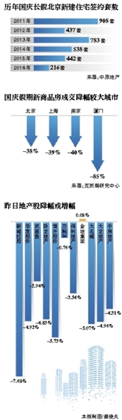 北京在9月30日出臺的政策影響了市場熱度,市場進(jìn)入了急速冷凍階段。中原地產(chǎn)研究中心統(tǒng)計(jì)數(shù)據(jù)顯示,2016年國慶長假期間,7天北京新建住宅簽約216套,二手房住宅簽約209套。合計(jì)簽約425套。而2015年國慶7天簽約為543套。從簽約數(shù)據(jù)看,北京新建住宅成交量為2011年來6年最低點(diǎn)。對此,中原地產(chǎn)首席分析師張大偉分析認(rèn)為,預(yù)計(jì)北京房價(jià)將快速降溫,四季度漲幅將明顯放緩,在自住房大量供應(yīng)后,部分區(qū)域的價(jià)格很可能出現(xiàn)調(diào)整。