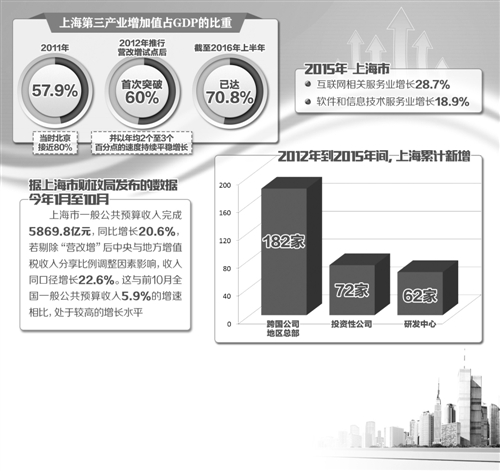 記者從上海市稅務(wù)局了解到,2012年推行營改增試點(diǎn)后,第三產(chǎn)業(yè)占GDP比重首次突破60%,并以年均2個至3個百分點(diǎn)的速度持續(xù)平穩(wěn)增長。截至2016年上半年,該比重已達(dá)70.8%。