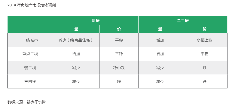 人民網(wǎng)北京12月27日電 (孔海麗)日前,鏈家研究院發(fā)布了《2018年房地產市場展望》研究報告。報告認為,2017年是房地產市場超級繁榮期的尾巴,預計2018年成交量將會下降,新房投資增速進一步下滑。就城市而言,預計一線城市二手房市場量價平穩(wěn),三、四線城市房地產市場將迎來量價的降溫。
