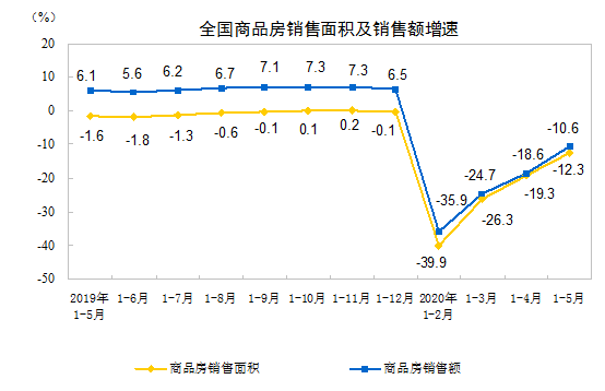 1—5月份,商品房銷售面積48703萬平方米,同比下降12.3%,降幅比1—4月份收窄7.0個百分點。其中,住宅銷售面積下降11.8%,辦公樓銷售面積下降26.7%,商業(yè)營業(yè)用房銷售面積下降21.7%。商品房銷售額46269億元,下降10.6%,降幅比1—4月份收窄8.0個百分點。其中,住宅銷售額下降8.4%,辦公樓銷售額下降35.3%,商業(yè)營業(yè)用房銷售額下降26.6%。