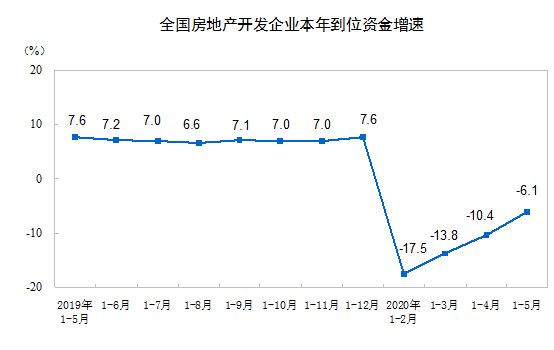 1—5月份,房地產(chǎn)開發(fā)企業(yè)到位資金62654億元,同比下降6.1%,降幅比1—4月份收窄4.3個百分點。其中,國內(nèi)貸款10703億元,下降0.5%;利用外資34億元,增長15.3%;自籌資金20106億元,下降0.8%;定金及預(yù)收款19479億元,下降13.0%;個人按揭貸款10154億元,下降0.9%。