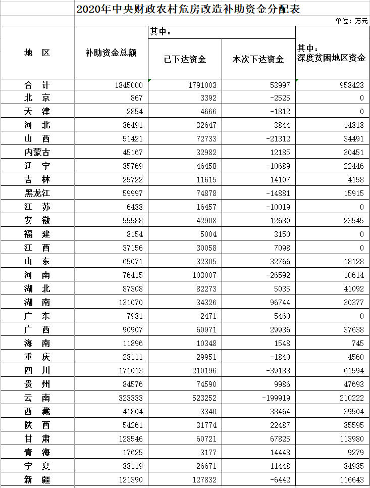 另外,根據(jù)有關規(guī)定,中央財政對《國務院辦公廳關于對2019年落實有關重大政策措施真抓實干成效明顯地方予以督查激勵的通報》(國辦發(fā)〔2020〕9號)確定的農(nóng)村危房改造激勵對象,按照每個激勵對象500萬元的標準,增加安排了其所在省(自治區(qū)、直轄市)的補助資金。有關?。ㄗ灾螀^(qū)、直轄市)應將該部分資金下達激勵對象,對其給予獎勵。