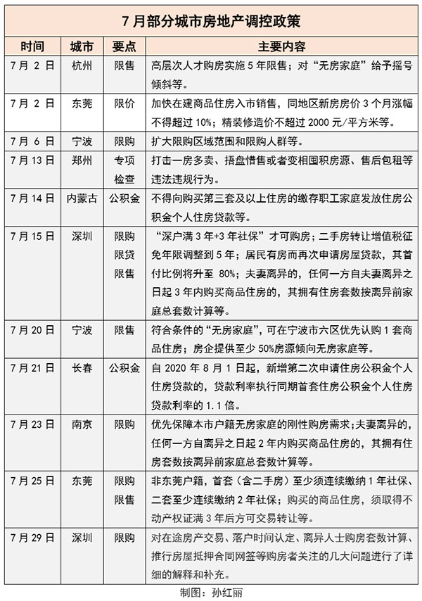 人民網(wǎng)北京7月31日電 (記者孫紅麗)7月以來,全國各地樓市調(diào)控開始收緊并加密。據(jù)不完全統(tǒng)計(jì),杭州、東莞、寧波、深圳、南京等8個(gè)城市先后對(duì)房地產(chǎn)調(diào)控政策“升級(jí)”。 多位業(yè)內(nèi)專家向人民網(wǎng)房產(chǎn)表示,二季度以來,部分熱點(diǎn)城市房價(jià)漲幅較高,土地市場偏熱,給房地產(chǎn)市場帶來一定不穩(wěn)定預(yù)期。在多場高級(jí)別會(huì)議強(qiáng)調(diào)“房住不炒”的政策基調(diào)下,“防止房地產(chǎn)過熱”“精準(zhǔn)調(diào)控”或成為下半年房地產(chǎn)工作的重點(diǎn)。 樓市局部偏熱或與“流動(dòng)性”和政策預(yù)期有關(guān) 二季度以來,部分熱點(diǎn)城市房價(jià)漲幅較高,土地市場偏熱,給房地產(chǎn)市場帶來一定不穩(wěn)定預(yù)期。 “全國百城房價(jià)上漲了11%,總體上房價(jià)略偏熱?!币拙友芯吭航展嫉娜珖?00個(gè)大中城市住宅價(jià)格報(bào)告指出,上半年雖然房屋交易行情面臨沖擊,但由于各類炒房資金進(jìn)入等原因,房價(jià)總體上依然處于相對(duì)高的漲幅水平。 58同城、安居客發(fā)布的數(shù)據(jù)亦顯示,7月全國重點(diǎn)監(jiān)測67城新房在線均價(jià)16458元/㎡,環(huán)比上漲0.04%。較上月,7月份房地產(chǎn)市場找房熱度有所回升,購房者信心指數(shù)環(huán)比上漲3.1%。 同時(shí),部分二線城市房價(jià)上漲幅度較大,尤其是一些“萬人搖”現(xiàn)象的城市,包括南京、杭州和成都等。數(shù)據(jù)顯示上半年這三個(gè)城市房價(jià)同比漲幅分別為10%、11%和21%。 國務(wù)院發(fā)展研究中心發(fā)展部研究員、研究室主任劉云中向記者表示,這一輪房價(jià)上漲與流動(dòng)性有關(guān),也與對(duì)房地產(chǎn)市場監(jiān)管放松的預(yù)期有關(guān)。事實(shí)上,也有部分城市對(duì)原有的調(diào)控政策進(jìn)行了局部放松。對(duì)于部分房價(jià)上漲較快的城市,則疊加了土地供應(yīng)、居民收入等因素。 打擊“假落戶”“假離婚”成此輪調(diào)控重點(diǎn) 近日,多場高級(jí)別會(huì)議重申“房住不炒”,向市場傳遞出明確信號(hào)。 7月24日,房地產(chǎn)工作座談會(huì)強(qiáng)調(diào),“牢牢堅(jiān)持房子是用來住的、不是用來炒的定位,堅(jiān)持不將房地產(chǎn)作為短期刺激經(jīng)濟(jì)的手段,堅(jiān)持穩(wěn)地價(jià)、穩(wěn)房價(jià)、穩(wěn)預(yù)期,因城施策、一城一策”。 7月30日,中共中央政治局會(huì)議要求,要堅(jiān)持房子是用來住的、不是用來炒的定位,促進(jìn)房地產(chǎn)市場平穩(wěn)健康發(fā)展。 記者梳理發(fā)現(xiàn),7月以來,多個(gè)城市圍繞收緊購房資格、限制資金違規(guī)進(jìn)入房地產(chǎn)、支持無房家庭購房、抑制投機(jī)炒房等方面進(jìn)行調(diào)控。