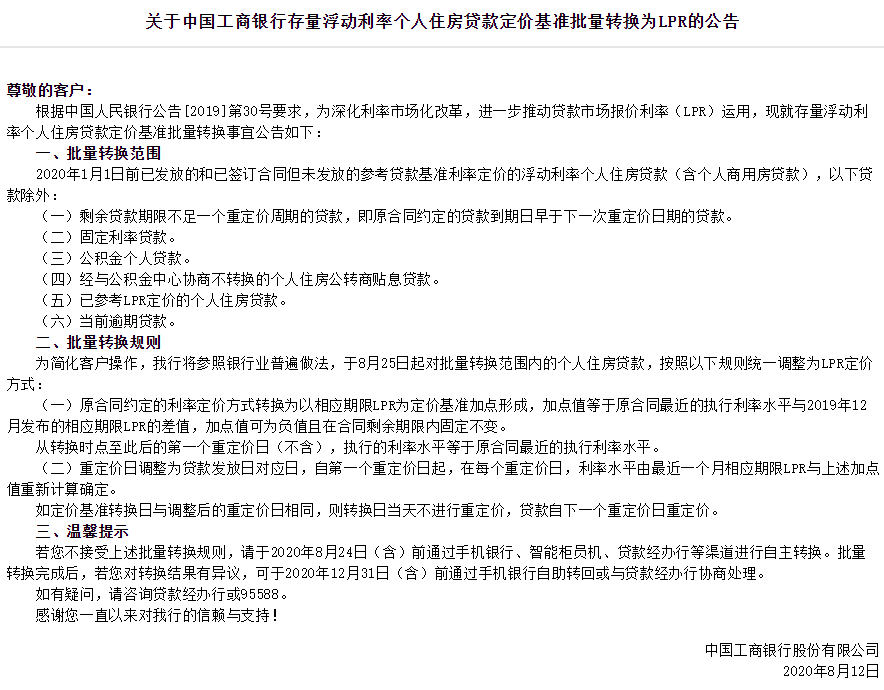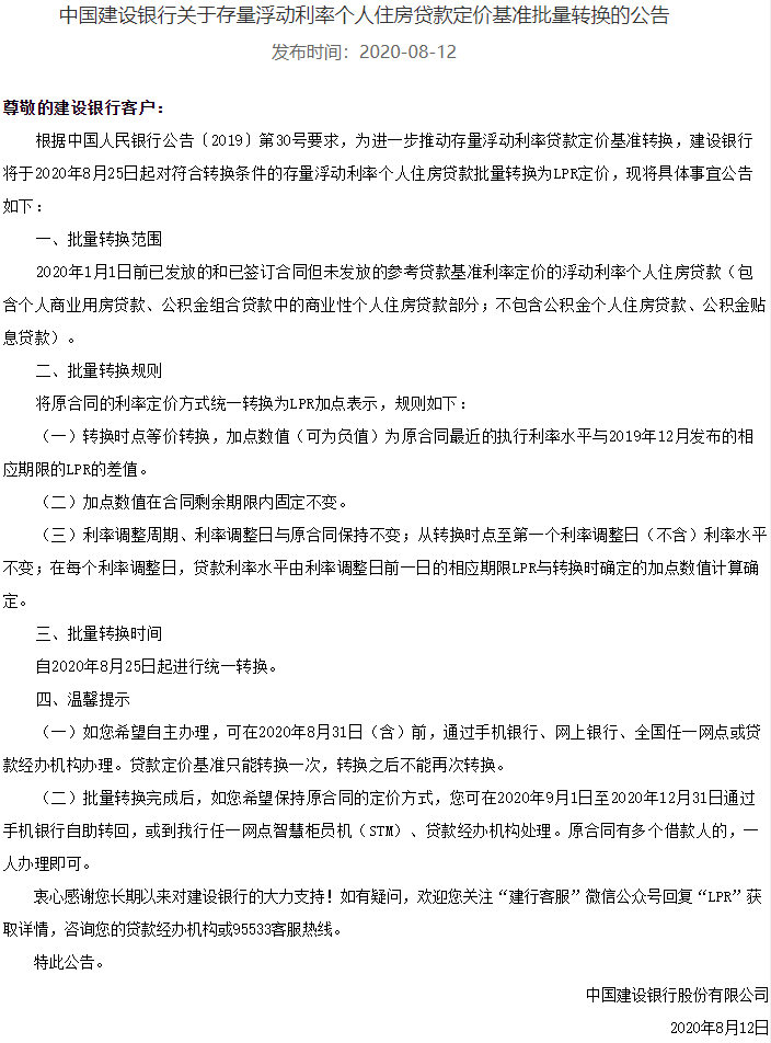人民網(wǎng)北京8月12日電(記者孫紅麗)今日,工商銀行、建設(shè)銀行、農(nóng)業(yè)銀行、中國銀行、中國郵政儲(chǔ)蓄銀行發(fā)布公告稱,將于2020年8月25日起對(duì)符合轉(zhuǎn)換條件的存量浮動(dòng)利率個(gè)人住房貸款批量轉(zhuǎn)換為LPR定價(jià)。