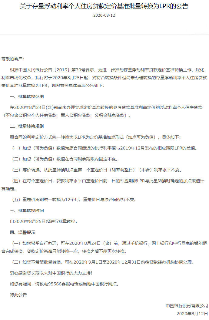 據(jù)悉,此前7月20日,交通銀行已經(jīng)發(fā)布公告,將于2020年8月21日對(duì)尚未轉(zhuǎn)換為貸款市場(chǎng)報(bào)價(jià)利率(LPR)或固定利率的存量浮動(dòng)利率房貸,統(tǒng)一調(diào)整為LPR浮動(dòng)利率加減點(diǎn)方式。