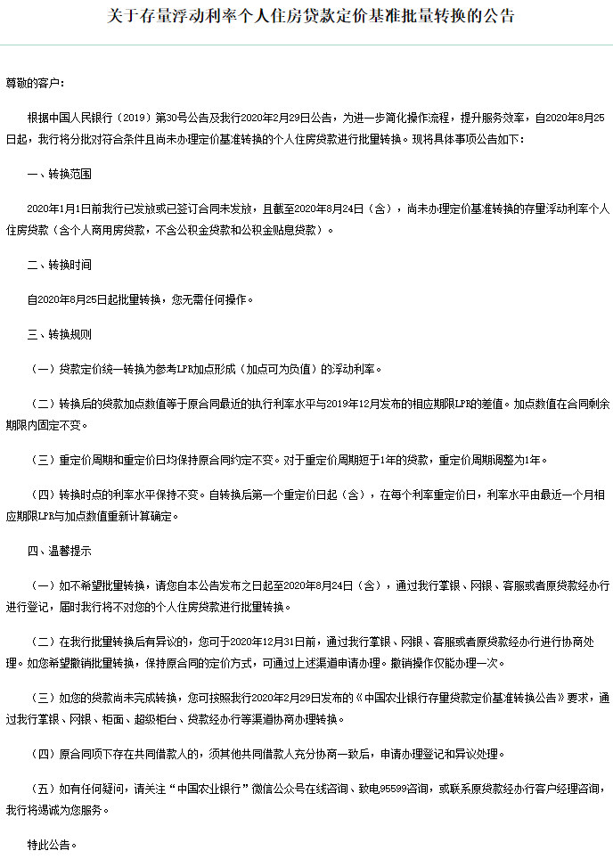 公告同時(shí)表示,批量轉(zhuǎn)換完成后,若對(duì)轉(zhuǎn)換結(jié)果有異議,可于2020年12月31日(含)前通過手機(jī)銀行自助轉(zhuǎn)回或與貸款經(jīng)辦行協(xié)商處理。