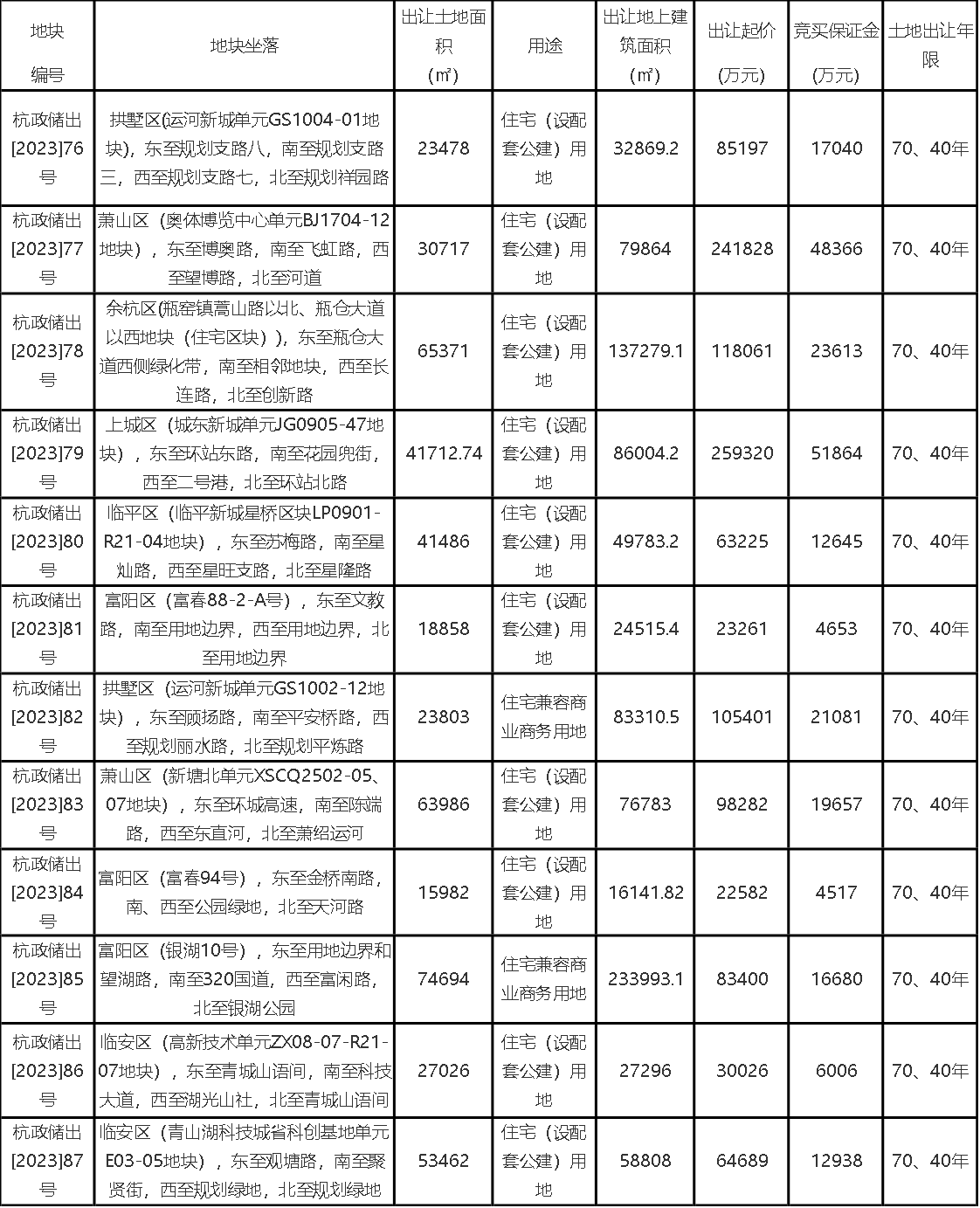 從地塊區(qū)域看,主要分布于主城四區(qū)3宗、蕭山區(qū)2宗、余杭區(qū)1宗、臨平區(qū)1宗、富陽區(qū)3宗和臨安區(qū)2宗。