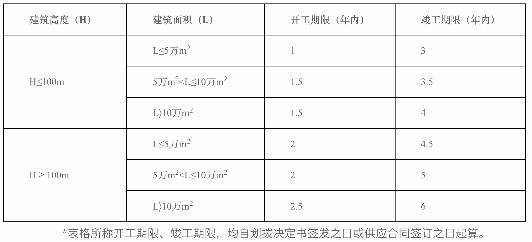 《辦法》根據(jù)項(xiàng)目用地性質(zhì)、建筑高度和建筑規(guī)模的不同,對建設(shè)用地的開工、竣工期限作出規(guī)定。(一)主體功能為住房類建設(shè)項(xiàng)目應(yīng)在劃撥決定書簽發(fā)之日或供應(yīng)合同簽訂之日起1年內(nèi)開工建設(shè),自劃撥決定書簽發(fā)之日或供應(yīng)合同簽訂之日起4年內(nèi)竣工。(二)主體功能為非住房類建設(shè)項(xiàng)目的開工、竣工期限按下表規(guī)則確定。其中,建設(shè)項(xiàng)目地下室≥3層的,其開工日期可再延長6個月,竣工期限相應(yīng)順延。