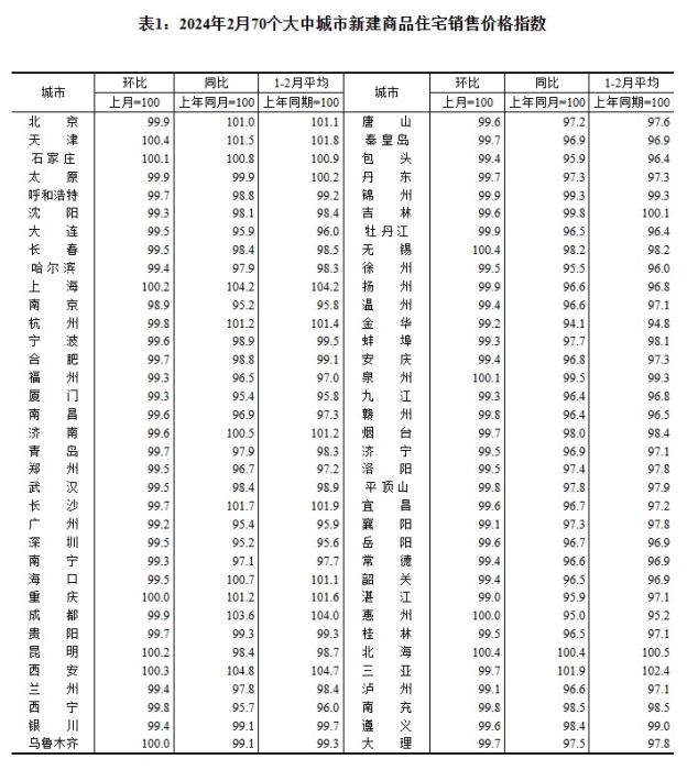 2024年2月70個(gè)大中城市新建商品住宅銷售價(jià)格指數(shù)。 截圖自國家統(tǒng)計(jì)局官網(wǎng)