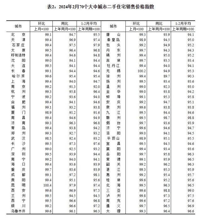 2024年2月70個(gè)大中城市二手住宅銷售價(jià)格指數(shù)。 截圖自國家統(tǒng)計(jì)局官網(wǎng)
