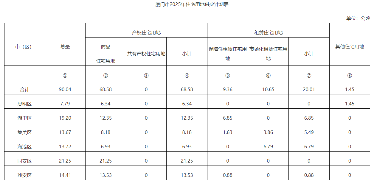 從住宅用地總量和結(jié)構(gòu)來看,2025年廈門市住宅用地計劃供應(yīng)90公頃,其中產(chǎn)權(quán)住宅用地69公頃(商品住宅用地69公頃,共有產(chǎn)權(quán)住宅用地0公頃),租賃住宅用地20公頃(保障性租賃住宅用地9公頃,市場化租賃住宅用地11公頃),其他住宅用地(拆遷安置房)1公頃。