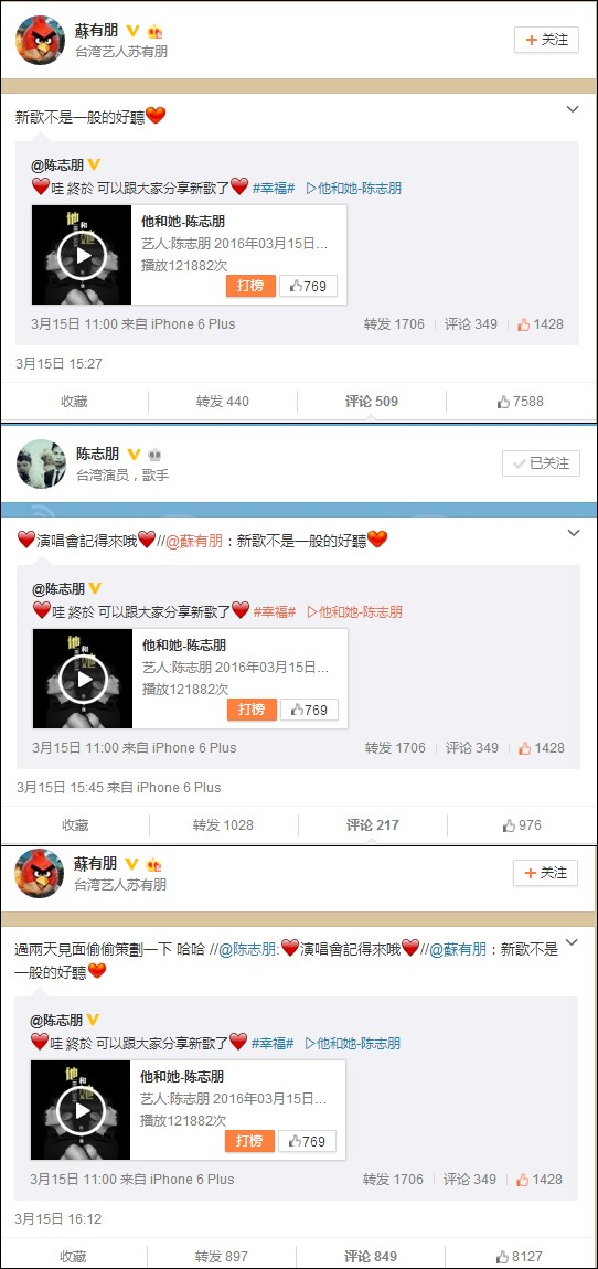 3月15日下午,臺(tái)灣歌手陳志朋在微博宣傳自己的新歌《他和她》,之前曾和陳志朋傳過不合的小虎隊(duì)另外一個(gè)成員蘇有朋第一時(shí)間轉(zhuǎn)發(fā)了該微博,并大贊“新歌不是一般的好聽”,幾分鐘后,陳志朋回復(fù)“演唱會(huì)記得來哦”,正當(dāng)大家以為互動(dòng)就這么結(jié)束的時(shí)候,蘇有朋“過兩天見面偷偷策劃一下 哈哈”。