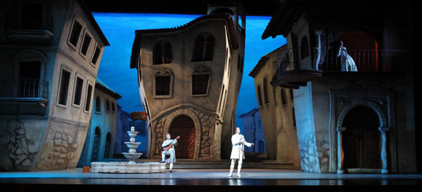 7月13日當(dāng)晚,隨著歌劇指揮莫蘭迪引領(lǐng)國家大劇院管弦樂團(tuán)奏出《塞維利亞理發(fā)師》膾炙人口的序曲旋律,大幕拉開,由著名舞臺設(shè)計師張武設(shè)計的“高迪建筑風(fēng)格”的塞維利亞小鎮(zhèn)展現(xiàn)在觀眾面前。