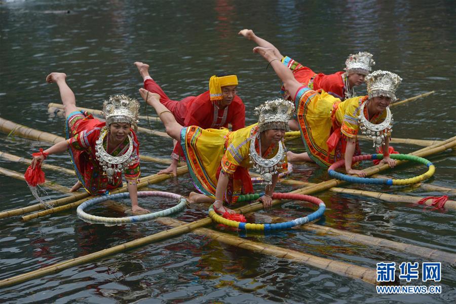 1月1日,“獨(dú)竹漂”愛好者在花溪河上表演水上高難度平衡動(dòng)作。 2016年元旦,在貴陽(yáng)市花溪公園平橋河段舉行的貴陽(yáng)市第31屆冬泳表演活動(dòng)中,數(shù)十名“獨(dú)竹漂”愛好者在花溪河上腳踏漂浮的竹竿,表演“金雞獨(dú)立”、轉(zhuǎn)身平衡等高難度動(dòng)作,讓觀眾大飽眼福。新華社發(fā)(秦剛 攝)