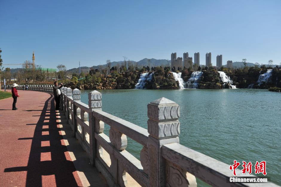 1月5日,游客在昆明瀑布公園內(nèi)游覽拍照。據(jù)了解,昆明瀑布公園1月1日開始對(duì)民眾開放,公園的瀑布利用牛欄江引水入滇工程而形成人工瀑布及湖泊,其利用約12.5米的地勢(shì)高差,建設(shè)成寬幅約400米的人工瀑布,是中國最大人工瀑布。 中新社記者 任東 攝