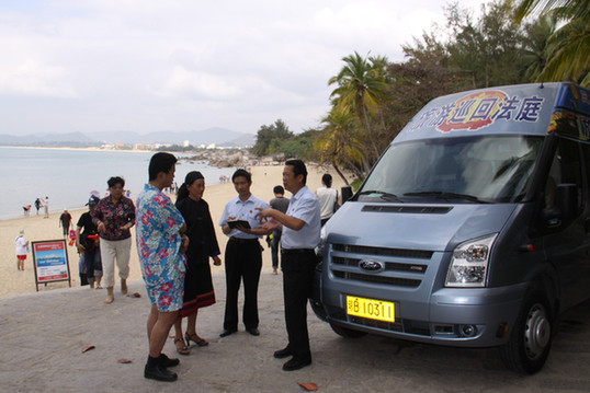 三亞旅游巡回法庭入駐景區(qū) 進入二十一世紀,三亞市憑借得天獨厚的資源優(yōu)勢,旅游業(yè)已經發(fā)展為該市的支柱產業(yè)。 三亞市旅游委副主任鄭聰輝介紹說,隨著游客與日俱增,旅游過程中發(fā)生的旅游服務合同、人身損害、財產損害等糾紛案件時有發(fā)生,且具有突發(fā)性、時效性等特點,雖然此類糾紛涉及標的額小、案情也不復雜,但往往糾紛雙方抵觸情緒大、矛盾容易激化,有些糾紛涉及人數(shù)較多,且人員來自全國各地,有些涉及境外國外,影響范圍較廣。這類糾紛如得不到及時妥善處理,不僅會對當?shù)芈糜涡蜗?、旅游環(huán)境、旅游市場秩序造成影響,甚至對國家形象也造成不良影響。 2002年4月,在充分調研基礎上,三亞市城郊人民法院依托天涯、崖城、藤橋3個人民法庭,設立了天涯海角、南山和亞龍灣三大國家級旅游景區(qū)旅游巡回法庭,在重大節(jié)假日全天候、平時不定期進駐景區(qū)開展法律服務,巡回辦案,適用簡易程序就地化解矛盾糾紛,成為全國首創(chuàng)的“景區(qū)移動法庭”,或者被稱為“三條法庭”,即一條橫幅、一條長桌、一條長凳,景區(qū)哪里有樹蔭就移到哪里辦案。在這樣的條件下,旅游巡回法庭的法官們風雨兼程,堅守了多年。 經過長期的實踐和總結,三亞旅游巡回法庭已經形成了較為完善的針對旅游糾紛一律適用簡易程序和“三定、四就、一重、兩免”的審判工作機制。 “三定”為定期、定點、定人;“四就”,即就地立案、就地審理、就地調解、就地執(zhí)行;“一重”就是注重調解;“兩免”就是對小額旅游糾紛案件免收訴訟費和申請執(zhí)行費。 2010年7月,海南省高級人民法院和三亞市編委批準三亞市城郊人民法院成立旅游審判庭,與該院成立的旅游訴訟服務中心實行有效銜接,進一步強化了巡回法庭快速審理旅游糾紛的工作機制,既可以克服巡回法庭沒有固定的辦案場所、僅憑節(jié)假日開展工作的不足,又能夠解決因游客大幅增加、旅游糾紛不斷攀升等新情況帶來的審判力量不足的問題,大大地滿足了旅游巡回審判的需求。至此,旅游巡回審判步入新的發(fā)展期。 2011年初,三亞市特批專款70多萬元,為旅游巡回法庭配置兩輛巡回審判車,車上設有國徽、法臺、原被告席、當事人座椅,還配備電腦、打印機,能即時制作裁判文書。從此,兩輛可以快立、快裁、快調、快結、快執(zhí)的巡回審判車開進了三亞各個景點,真正實現(xiàn)了哪里有旅游投訴和糾紛,巡回審判車就在第一時間趕到哪里。 此外,法庭還在各個景區(qū)設立“旅游訴訟服務中心”的指示牌,上面有法庭值班電話和法官手機號碼,游客有了糾紛,只要打個電話,法官就會來到游客的身邊。至此,旅游巡回法庭真正實行了“110”旅游審判新模式:即快速趕赴現(xiàn)場、快速了解情況、快速受理、快速裁判、快速執(zhí)行。 據(jù)了解,自開展旅游巡回審判以來,截至2015年3月,旅游巡回法庭共處理旅游咨詢、調處非訴糾紛和審理訴訟案件1.1萬件,其中調處非訴和旅游訴訟案件2595件,審限內結案率達100%,旅游巡回辦案調解率達100%。 多部門聯(lián)動 共建依法治旅“朋友圈” 近日,在三亞市民游客中心,記者看到除了旅游巡回法庭外,12301旅游調度指揮中心、旅游質量監(jiān)督管理局、工商局旅游市場管理局、旅游糾紛人民調解委員會等10多個涉旅部門同場辦公。可見,旅游巡回法庭不是孤軍奮戰(zhàn),它有一個強有力的朋友圈。