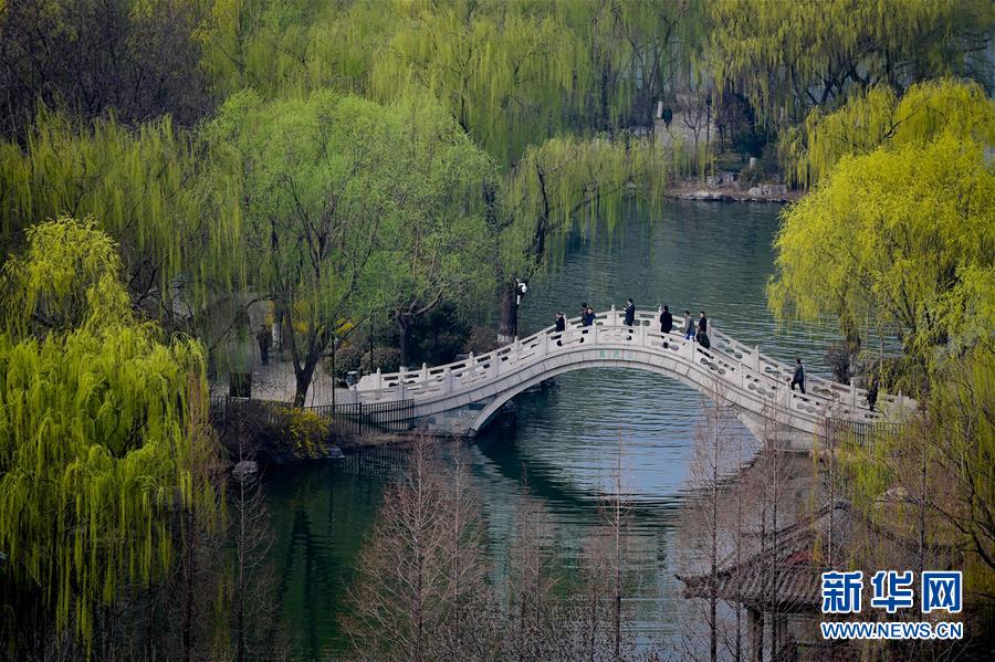3月17日,山東濟(jì)南大明湖畔楊柳吐翠,杏花飄香,市民踏春游湖盡享明媚春光。 新華社記者 郭緒雷 攝