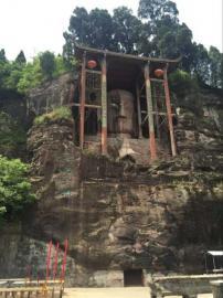 沿石梯而上,一面數(shù)百平米的石壁上,一尊大佛坐西向東,依巖而建。據(jù)測量,大佛高15.85米,寬11米。其中頭高7.7米,面寬4.6米。佛頭之上,一座木質(zhì)廊亭像一把巨傘,為其遮風(fēng)蔽雨。胸側(cè)各站一力士,均高1.9米,腰系裙,穿甲,甲紋似魚鱗,身繞帔帛,立于臺基上。大佛胸下部分與高聳巖石融為一體,氣勢磅礴。