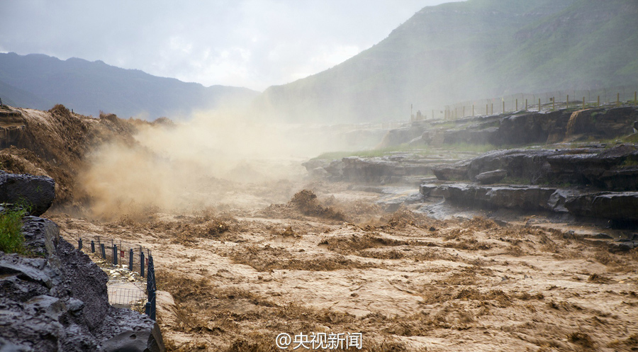 受上游強(qiáng)降雨和水庫(kù)放水影響,最近幾天,黃河壺口瀑布迎來伏汛,最大水流量達(dá)到每秒2600立方米左右,濁流滾滾奔騰而下,氣勢(shì)磅礴?。ㄑ胍曈浾呃钪?文豪)