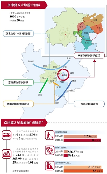 按照這一宣言,除京東旅游休閑示范區(qū)外,密云、延慶、承德、張家口共建京北生態(tài)(冰雪)旅游圈,其中延慶、張家口共建京張體育文化旅游帶。房山、保定將共建京西南生態(tài)旅游帶,其中包含京西百渡休閑度假區(qū)。武清、廊坊將共建京南休閑購物旅游區(qū),濱海新區(qū)、唐山、滄州將共建濱海休閑旅游帶。