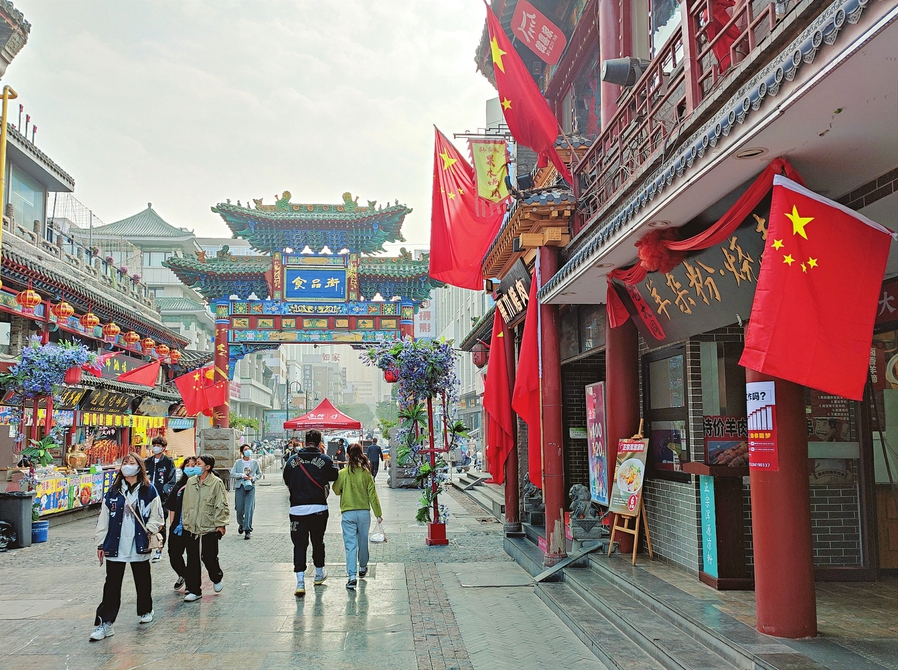10月7日,省城食品街,在查驗(yàn)雙碼、測(cè)量體溫后,游客愉快購(gòu)物、體驗(yàn)美食,享受假期的輕松和歡樂。