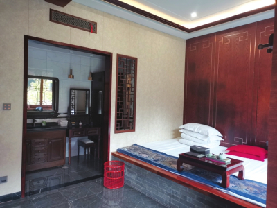這里的房間比一般客棧寬敞許多,而且每間房都風(fēng)格迥異,比如有的床頭是充滿意境的書畫,有的床頭是雕刻花紋的木板,有的多了古典桌椅,有的放置了茶幾,有的則多了沙發(fā)、屏風(fēng)或條幾、膽瓶……每間房都融合了寧?kù)o與古樸的元素,屋子里擺放的瓷壇和衣柜等老物件寫滿歲月的痕跡。