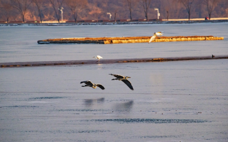 在晉城市丹河新城鳳棲湖水面上飛翔的各種鳥兒。