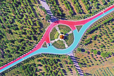 在得勝堡不遠處,長城一號旅游公路蜿蜒而過。車行其上,仿佛置身于絢爛的畫卷之中,紅藍黃交織的道路色彩鮮艷;環(huán)顧四周,云海翻騰。長城驛站為游客提供休憩之所,路旁是遼闊的綠丘和連綿的樹林。