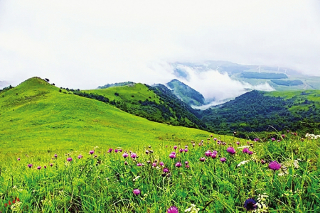 花坡平均海拔有2500米,是太岳山的主峰之一。山頂坡度平緩呈饅頭形,林木稀少,遍地生長(zhǎng)著矮草類高山植物,是天然的優(yōu)良牧場(chǎng)。一面面舒緩起伏的山坡上,綠草如茵,繁花似錦,紅色的、粉色的、黃色的……五顏六色的各種不知名的爛漫山花在這里匯聚,幾乎看不到裸露的泥土。