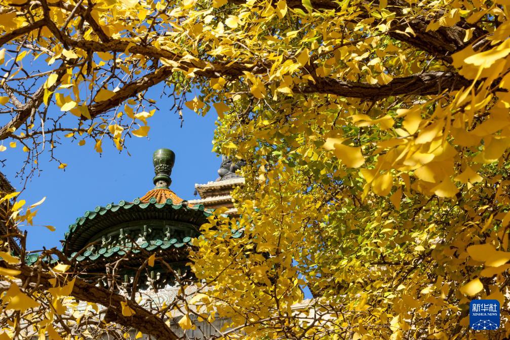 晚秋時(shí)節(jié),北京五塔寺院內(nèi)銀杏盡黃,吸引許多市民、游客賞秋游園。
