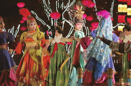 有才華的游客可以在《盛唐密盒》處舉手示意,與演員互動(dòng);喜歡李白的游客可以在《詩(shī)歌藝術(shù)》處與李白 對(duì)詩(shī);《花車(chē) 斗彩》處西域胡姬與大唐美女現(xiàn)場(chǎng)斗舞,彰顯盛唐時(shí)期絲路文化和盛唐文化的和諧交融,仿佛到了古裝電視劇中的上元節(jié);《貞觀之治》處則可感受李世民時(shí)期萬(wàn)國(guó)來(lái)朝賀的盛世景象;一路有行為藝術(shù),《武士雕刻》《奮斗在路上》《畫(huà)中人》《戲演壁畫(huà)》等讓人目不暇接,一路走走停停,到達(dá)最南端的開(kāi)元廣場(chǎng),就可以看一場(chǎng)大唐不夜城場(chǎng)地最大、演員最多、時(shí)間最長(zhǎng)的表演《再回長(zhǎng)安》,感受大詩(shī)人白居易回長(zhǎng)安的盛大氛圍;開(kāi)元廣場(chǎng)東側(cè)不倒翁小姐姐表演,周?chē)矅芏嘤慰停贿h(yuǎn)萬(wàn)里前來(lái)一睹小姐姐美麗的身姿。