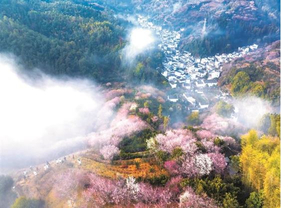 早春時節(jié),賣花漁村周邊漫山綻放的梅花與徽派村落民居相映成趣,景美如畫,吸引游客踏春賞花。
