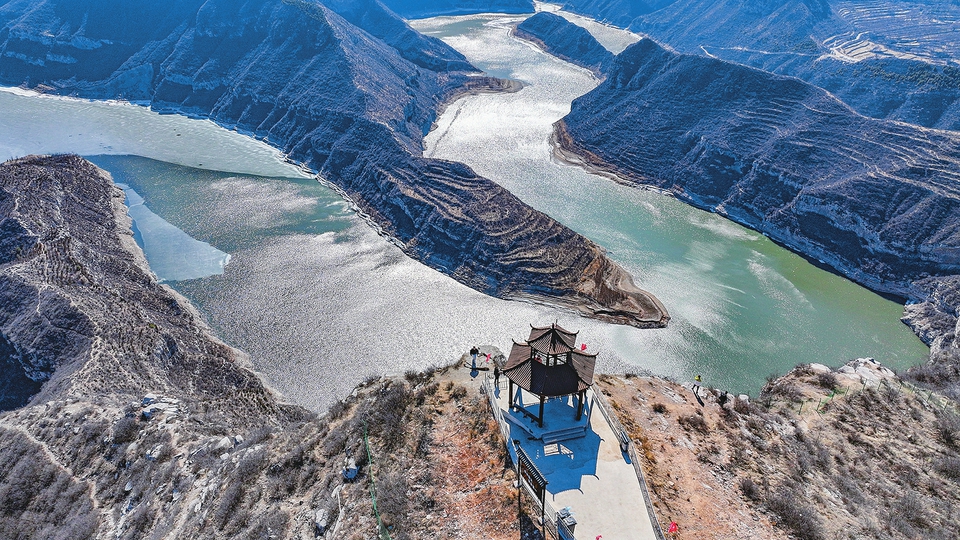 3月16日,古交市緊鄰汾河二庫的角子崖景區(qū),游人正在新建的觀景亭上體驗大自然的神奇。伴隨著春天的腳步,近日角子崖景區(qū)內(nèi)的汾河呈現(xiàn)出春日里獨有的“冰水交融”景觀,吸引眾多游客前來觀賞。