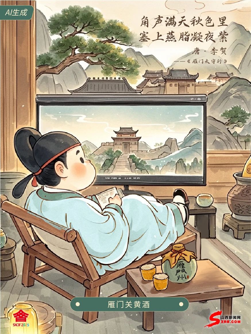 好久不見,我是李賀 那年秋天,雁門關(guān)下 戰(zhàn)爭的號角嗚嗚咽咽 城墻的泥土在暮色下染作一片紫霞 如今,國泰民安四海升平 我終于能悠悠喝著黃酒 透過文博會那神奇的大屏幕 好好欣賞雁門關(guān)的壯闊美景