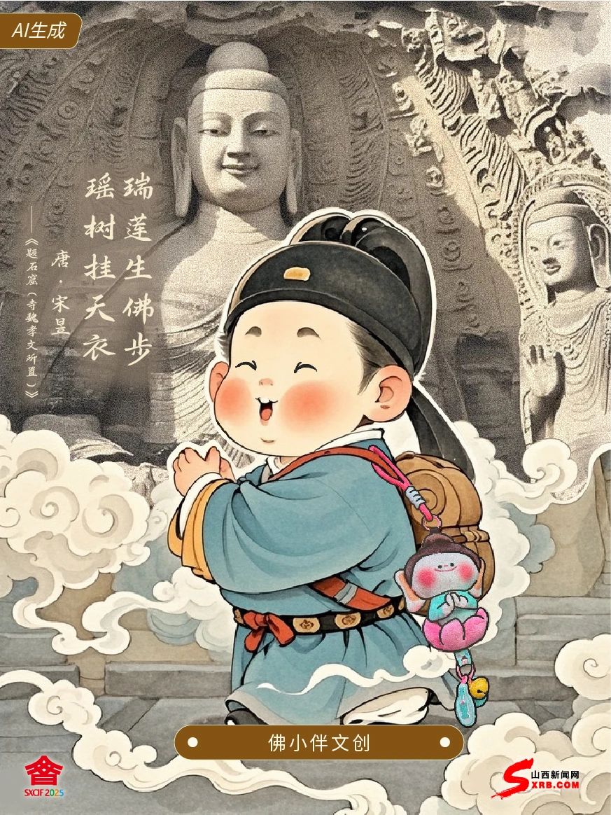 我是宋昱 你可能不認識我 但你一定聽過我筆下的云岡石窟 佛寺巍峨寬廣,金碧輝煌 香案雕琢精美,眾靈在云端飛舞 文博會上 背包上晃悠著“佛小伴”的掛件 在展會流轉(zhuǎn)的光影之中 仿佛看見蓮花在佛陀腳下悄然生長