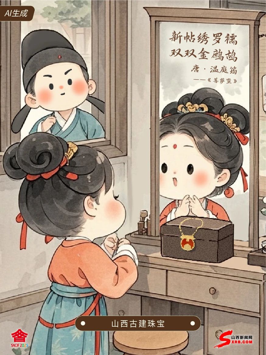 眉毛彎彎如小山 鬢發(fā)蓬松似云朵 姑娘啊,我是溫庭筠 想問你為何對鏡傷懷 送你這條文博會上 淘來的小驚喜 珠寶項鏈融合建筑斗拱 正好襯你襦裙上的金鷓鴣 愿你如鳥斯革,熱烈飛揚
