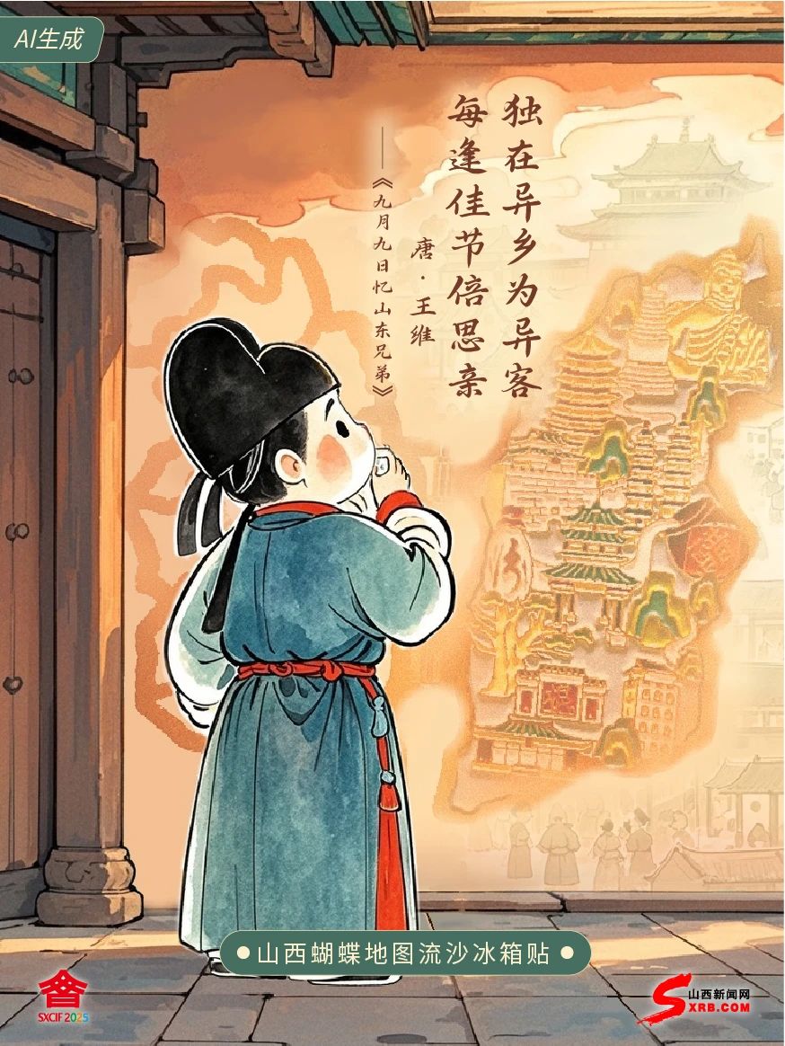 老鄉(xiāng)們 我是王維 闊別多年 終于回到家鄉(xiāng)山西 文博會上 我一眼就看見山西地圖做成的 蝴蝶流沙冰箱貼 蝴蝶破繭正如山西文化在當代煥發(fā)新生 當年我十七歲漂泊在外 重陽登高之時分外思念家鄉(xiāng) 如今家鄉(xiāng)發(fā)展得越來越好 縱使四海為家 也始終心有歸途