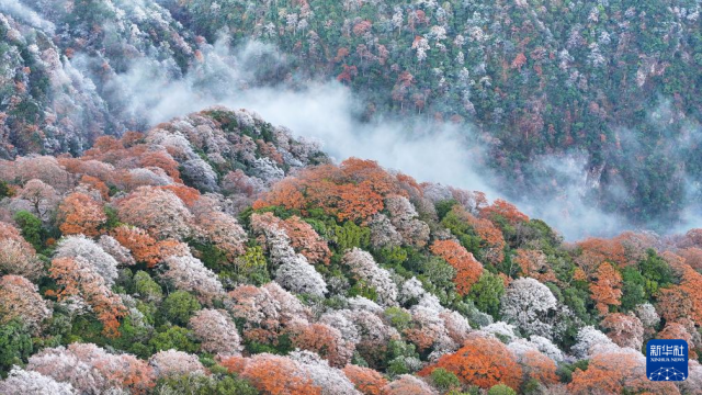 11月18日在貴州梵凈山景區(qū)拍攝的霧凇紅葉景觀(無人機(jī)照片)。新華社發(fā)(李鶴攝)