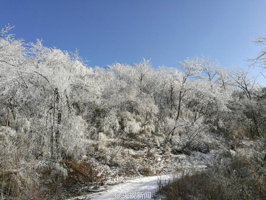 受較強(qiáng)冷空氣影響,秦嶺腹地涼風(fēng)埡山頂,出現(xiàn)大面積霧凇景觀。玉樹(shù)瓊枝,晶瑩剔透,讓涼風(fēng)埡山頂變得像童話世界一般,美不勝收。 央視記者王志杰 圖片來(lái)源:央視新聞微博
