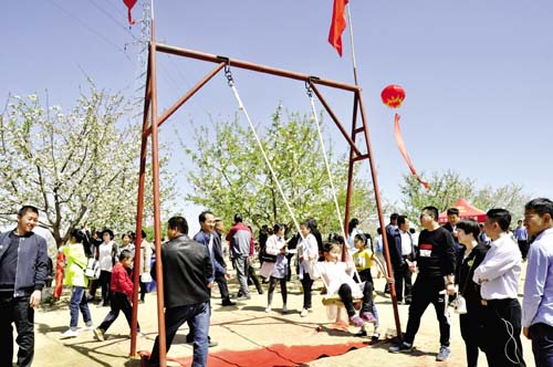 4月23日,為了進(jìn)一步鞏固脫貧成效,提升鄉(xiāng)村旅游品牌效應(yīng),展示當(dāng)?shù)靥厣r(nóng)產(chǎn)品和黃土高原的風(fēng)土人情,保德縣楊家灣鎮(zhèn)段家溝村隆重舉辦了首屆美麗鄉(xiāng)村賞花攝影節(jié)。圖為前來(lái)賞花的游客正在蕩秋千。(劉澤宇 攝)