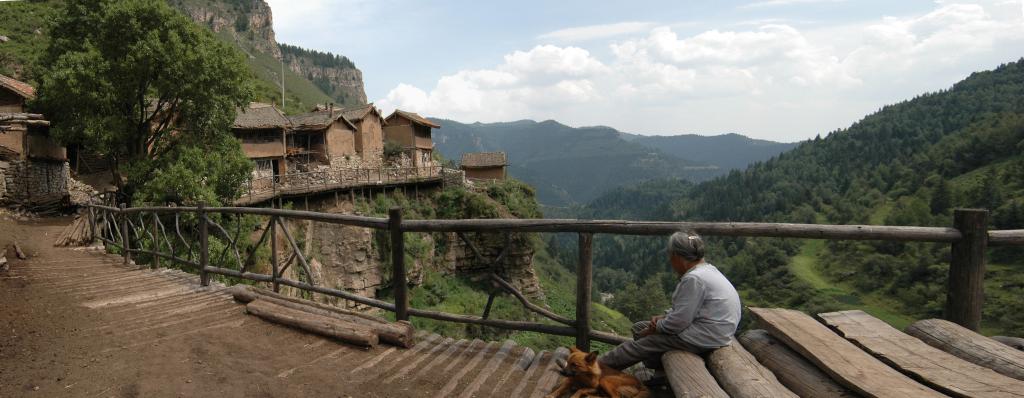 隱沒在深山老林中的王化溝分布在大約一華里長的絕壁上,背依懸崖,面臨百丈深淵。全村20余戶,60多口人。村西的懸崖上聳立著一塊巨石,村里人稱之為“石人”,村后的山也因此稱作“石人山”。村中的房子大都臨崖而建,以木柱支撐,高低錯落,避風向陽。這些房子建在懸崖上看似危險,實則非常堅固,至今還有清代的房子保存完好。由于地盤不足,所以沒了庭院,只有一條走廊。就是街道也只能用木料搭建,懸于空中。當然作為農(nóng)家,牲畜的圈舍是免不了的,這里也需要精心擺布,精心建造,絕不至于讓牲畜落下深淵。