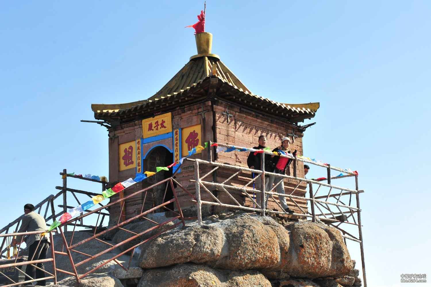 殿中所供“太子”,就是佛祖如來(lái)的法身毗盧佛。每遇干旱少雨,附近州縣的百姓便來(lái)這里求雨。為了顯示求雨者的誠(chéng)心,一群男人頭戴柳梢帽,赤腳光膀,用長(zhǎng)桿抬著當(dāng)?shù)氐摹褒埻鯛敗?,敲鑼打鼓,一路走?lái),到山腳下,便要三步一叩拜,一直拜到“離天最近”的太子殿祈雨。據(jù)說(shuō),這種做法非常有效,求雨人總能在回家的路上看到甘霖喜降。