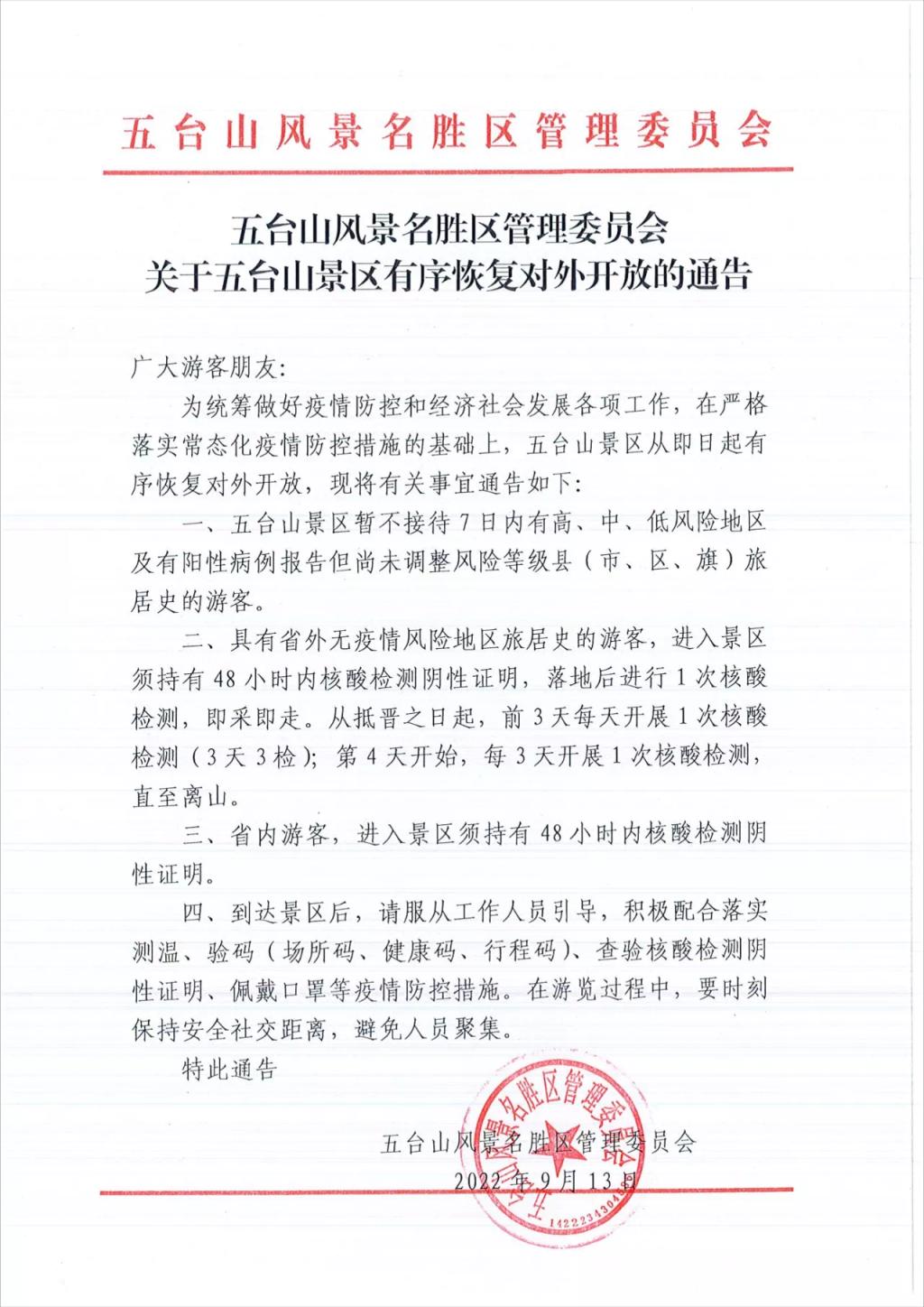 關(guān)于五臺山景區(qū)有序恢復(fù)對外開放的通告