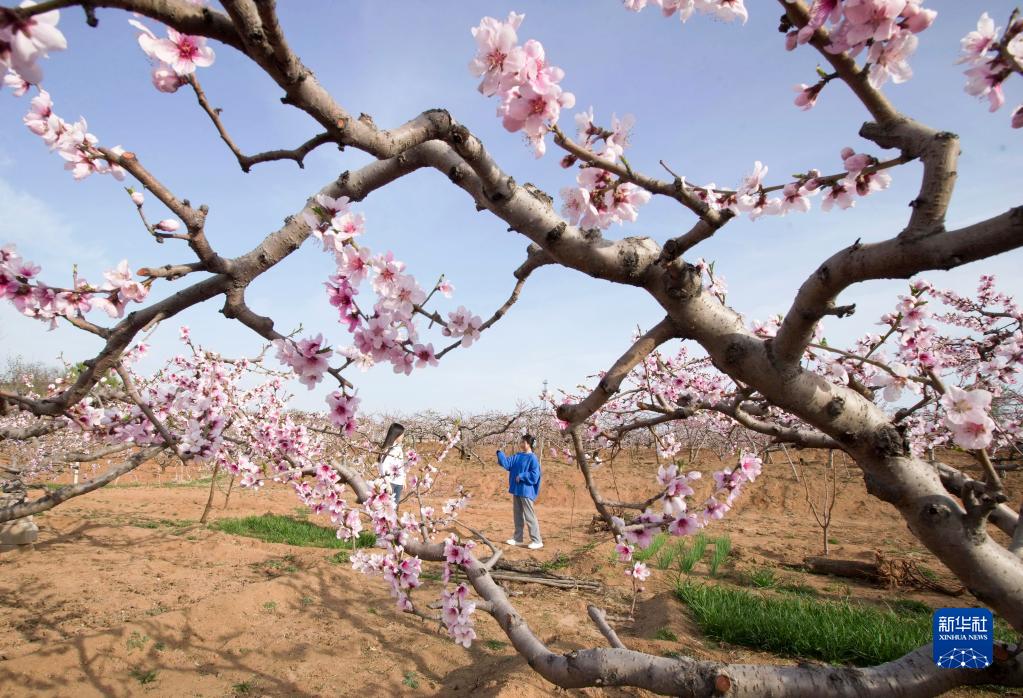 4月19日,游客在秦皇島市山海關(guān)區(qū)孟姜鎮(zhèn)一處桃園內(nèi)拍照。