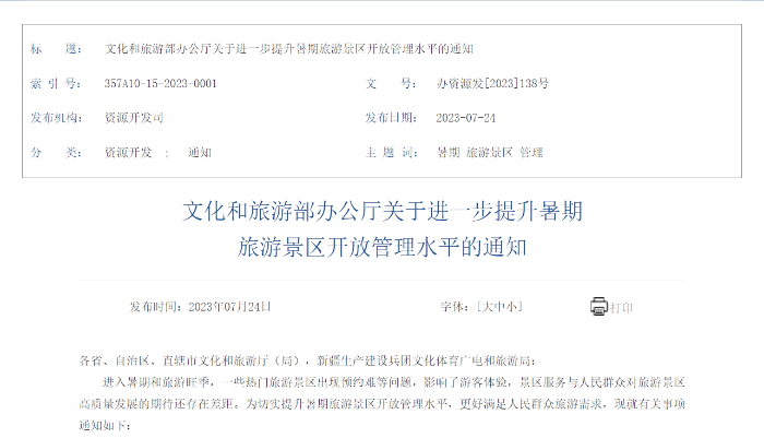 近日,文化和旅游部網(wǎng)站發(fā)布“關于進一步提升暑期旅游景區(qū)開放管理水平的通知”,從優(yōu)化預約管理、強化彈性供給、推動產(chǎn)品創(chuàng)新、提升服務質(zhì)量、實施錯峰調(diào)控、規(guī)范市場秩序、嚴守安全底線、強化宣傳引導八方面作出部署。