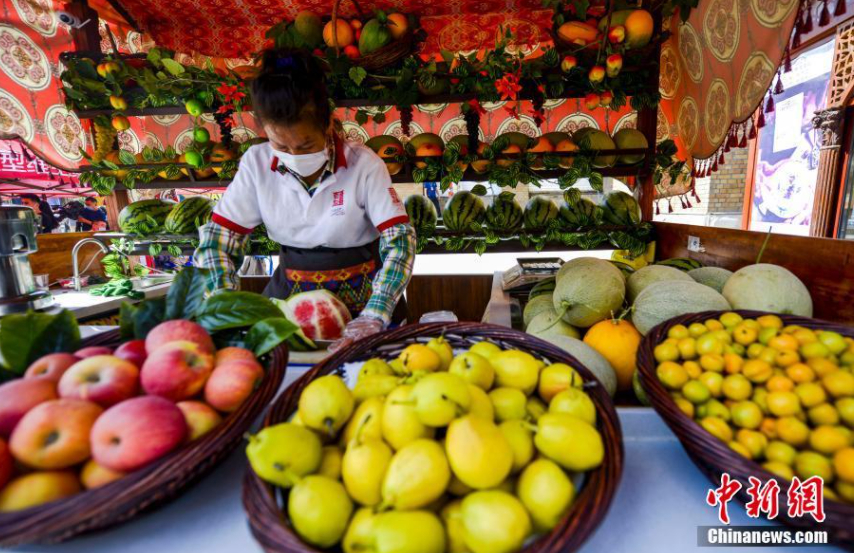 新疆一水果攤位,商戶正在切西瓜,制作水果拼盤。劉新 攝
