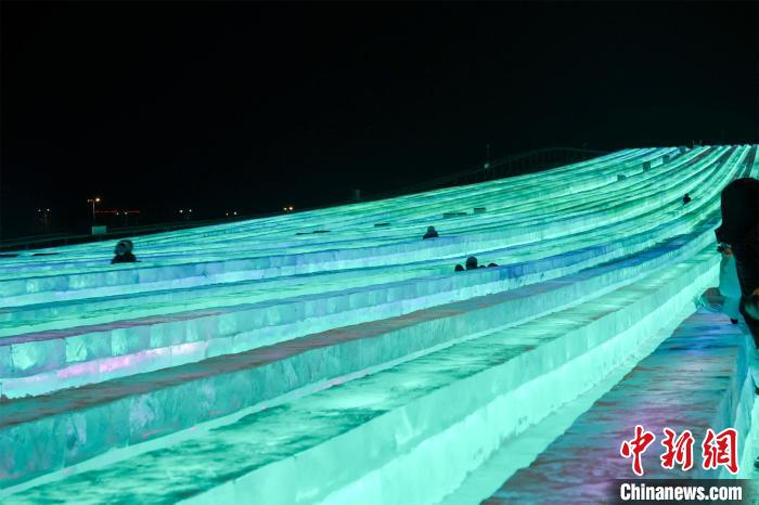 小朋友在哈爾濱冰雪大世界體驗(yàn)冰滑梯 趙宇航 攝 當(dāng)晚,景區(qū)戶外氣溫-27℃,游客們在嚴(yán)寒天氣中暢玩。在夢想大舞臺前,網(wǎng)紅主持人“左右哥”喊起“左腳右腳”的口號,游客們伴隨節(jié)奏在冰天雪地中勁歌熱舞。