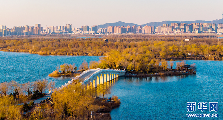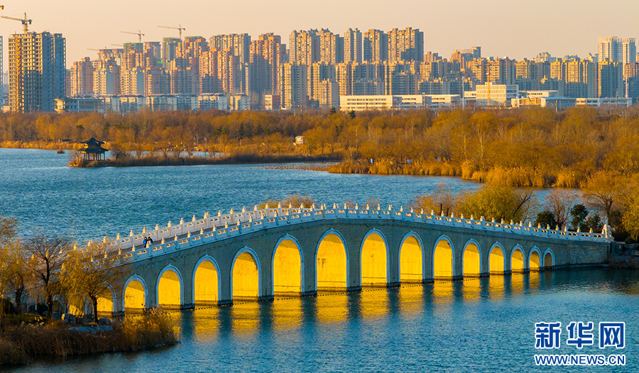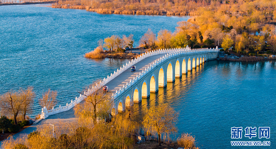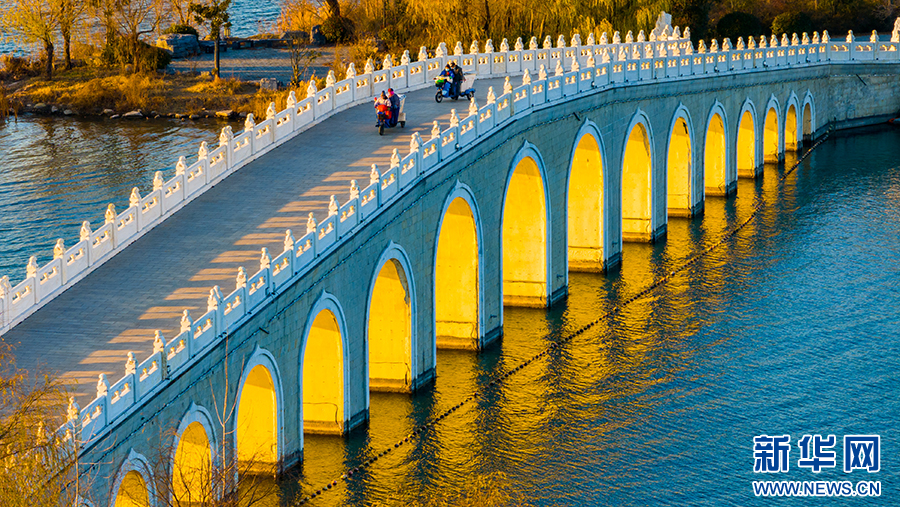 近日,天氣晴好,安徽省淮北市南湖濕地公園的十七孔橋在夕陽的照射下,呈現(xiàn)“金光穿洞”景象,美不勝收。新華網(wǎng)發(fā)(王文 攝)